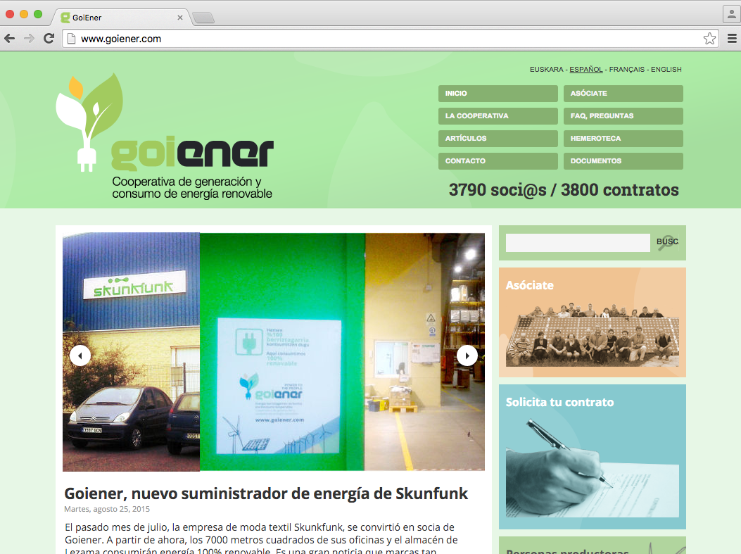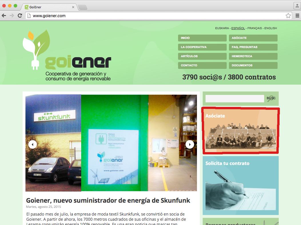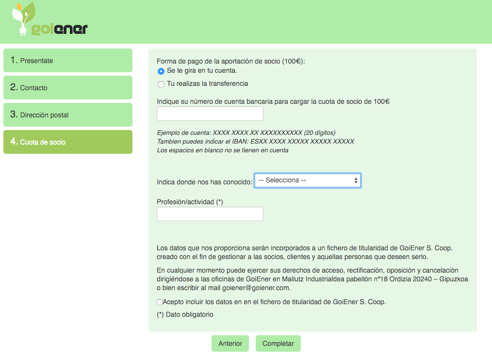 Goiener es una cooperativa y para ser cliente de ellos es necesario ser soci@. Para asociarse es necesario hacer una aportación de 100€ que nos serán devueltos si algún día decidimos dejar de ser soci@s. Esta aportación ayuda a que el proyecto siga adelante trabajando por el consumo y producción de energías renovables. Serás copropietari@ y todos los miembros tienen el mismo voto con una única aportación reembolsable de sólo 100€.